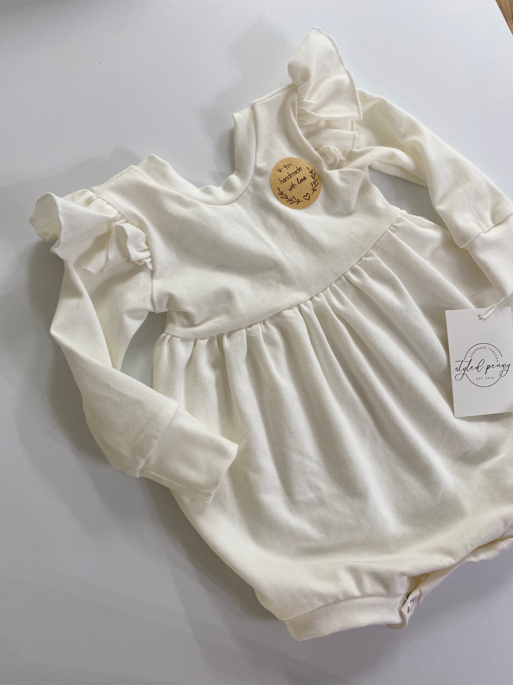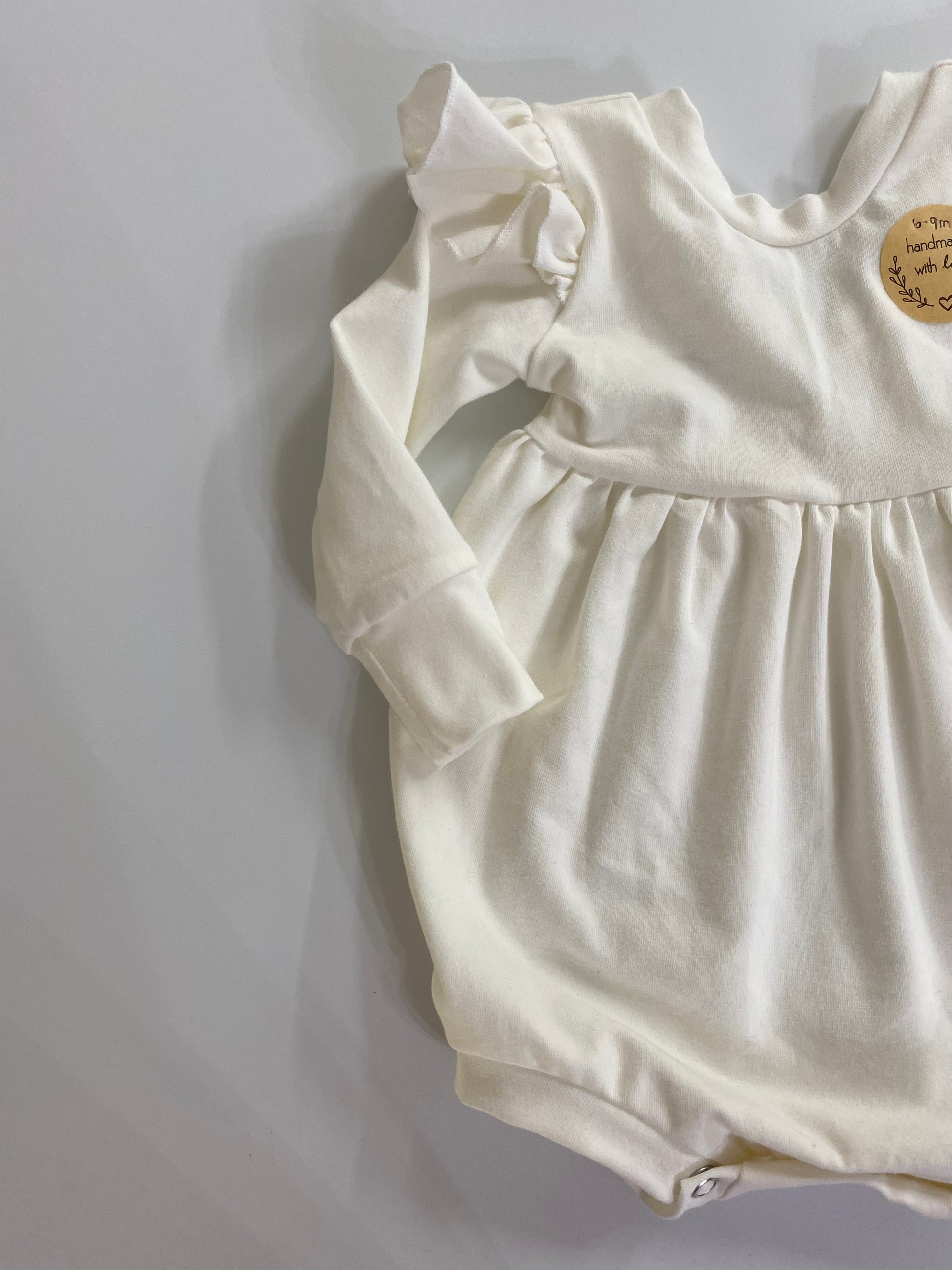Handmade from a light weight cotton spandex jersey. Scoop neck back. Snap closure for diaper changes.
